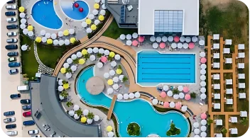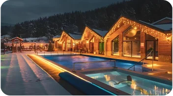 Комплексът включва воден парк с 5 басейна с минерална вода, уелнес зона със сауна, парна баня и солна стая, както и разнообразни заведения като ресторант, джелатерия, коктейл бар и воден бар.